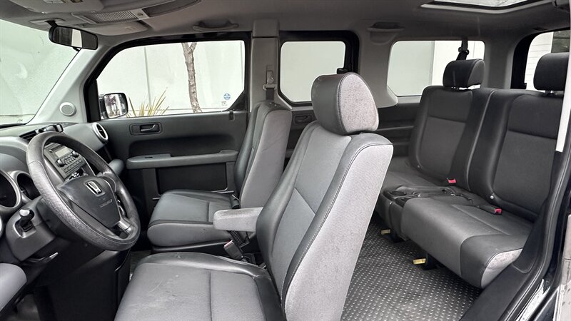 Dressed in the sophisticated Nighthawk Black Pearl, this Honda Element stands out with its distinctive boxy shape and bold presence. The exterior design is not only eye-catching but also highly functional, featuring large, easy-to-access doors that provide unmatched convenience for passengers and cargo alike.
