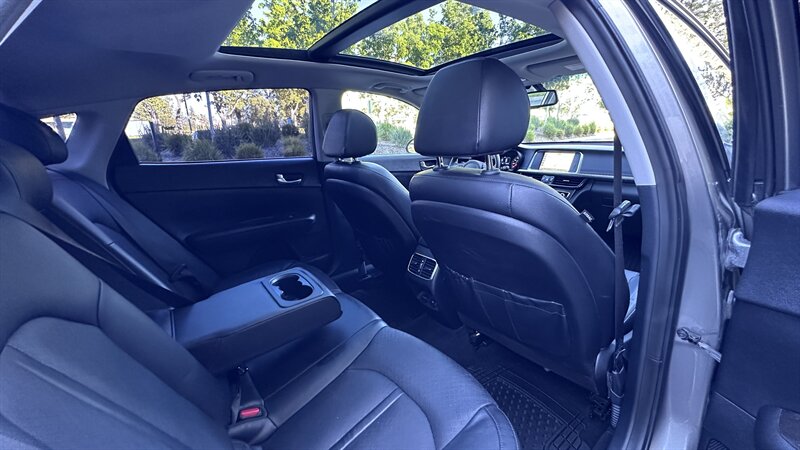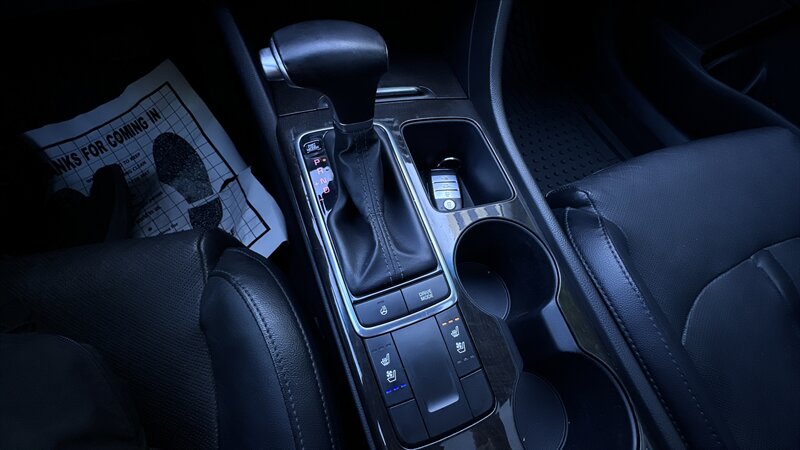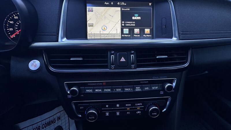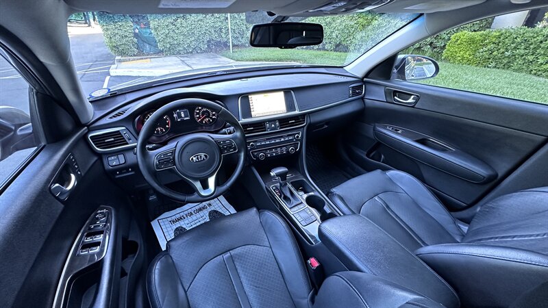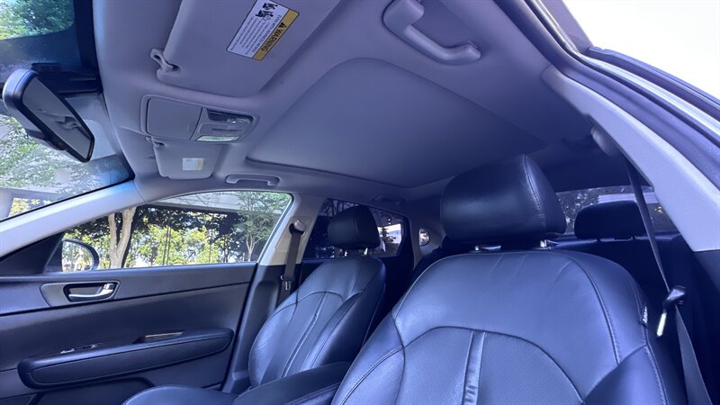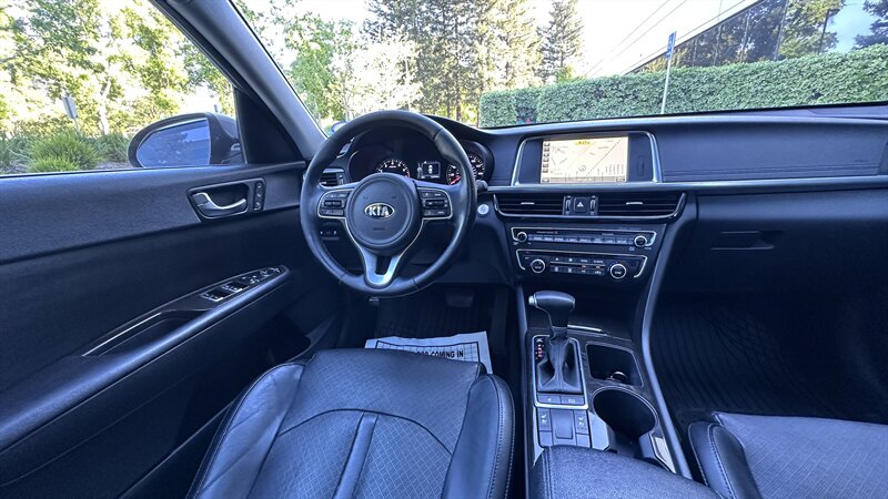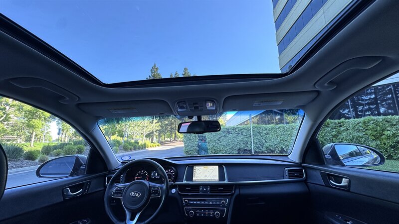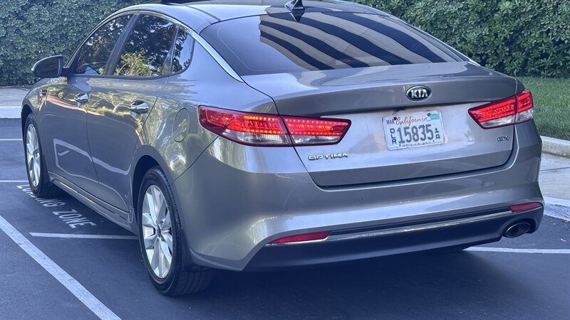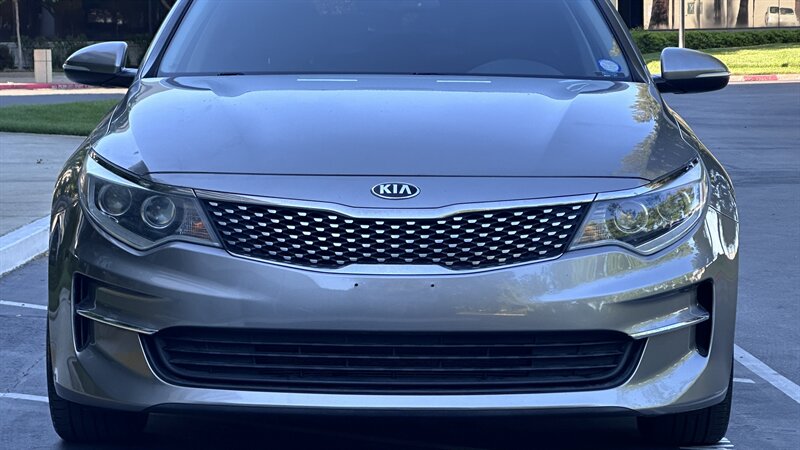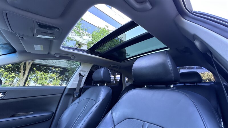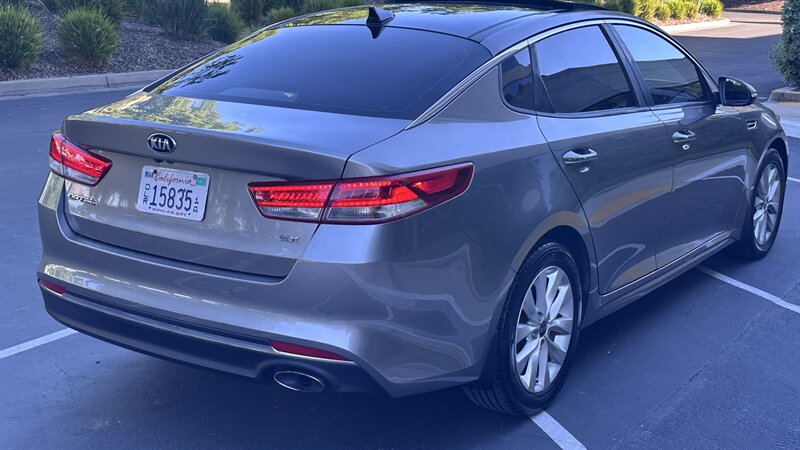 2016 Kia Optima EX in Moss Gray with Black leather interior. Powered by a 2.4L , this Optima returns an EPA-equivalent 24 MPG city / 35 MPG highway. Factory-equipped features include leather seating surfaces, heated front seats, power-adjustable driver’s seat, dual-zone automatic climate control, keyless entry with push-button start, Bluetooth hands-free and USB/AUX connectivity, steering-wheel audio and cruise controls, rearview camera, alloy wheels, and a full safety suite with ABS, traction and stability control, and multiple airbags. This vehicle also carries the Paint Protection Film Package, Premium Audio Package, and Premium Package—providing clear protective film for high-impact areas, an upgraded audio system, and additional comfort and convenience enhancements—and is in excellent overall condition.